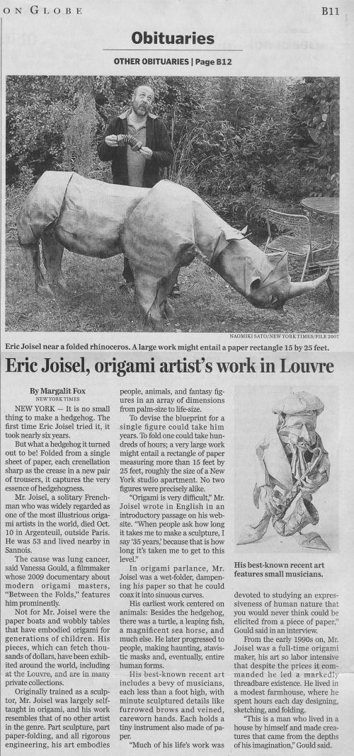 Eric Joisel et moi avons assisté au dernier Festival du Sud-Est de l’origami à Charlotte, Caroline du Nord, 2002. À cette époque, j’étais président de la British Origami Society, et j’ai encouragé les amateurs américains à rejoindre le BOS partout où je le pouvais, et à distribuer des brochures et d’autres supports promotionnels. . Eric m’a taquiné à ce sujet, en disant: « Oh, je ne le crois pas! Avez-vous déjà arrêté cette publicité BOS, Dave? »